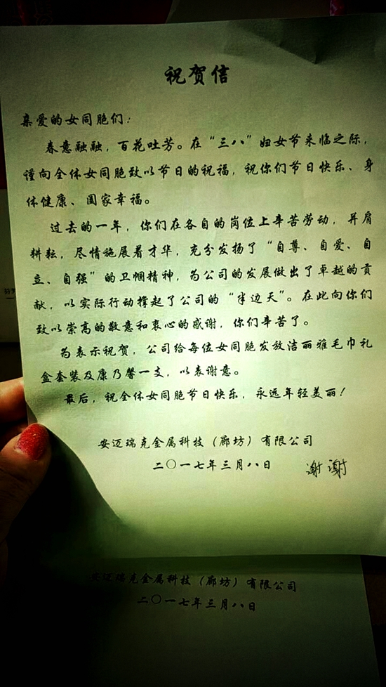 這些美麗、勤勞、善良的女員工發(fā)揮著各自的才華和智慧,她們以自己的實(shí)際行動(dòng)撐起了公司的“半邊天”, 公司的發(fā)展離不開(kāi)她們的辛勤付出。在這個(gè)特別的日子里,公司為每位女員工準(zhǔn)備了節(jié)日禮品及祝賀信,體現(xiàn)了公司對(duì)女員工的關(guān)愛(ài)和尊重。